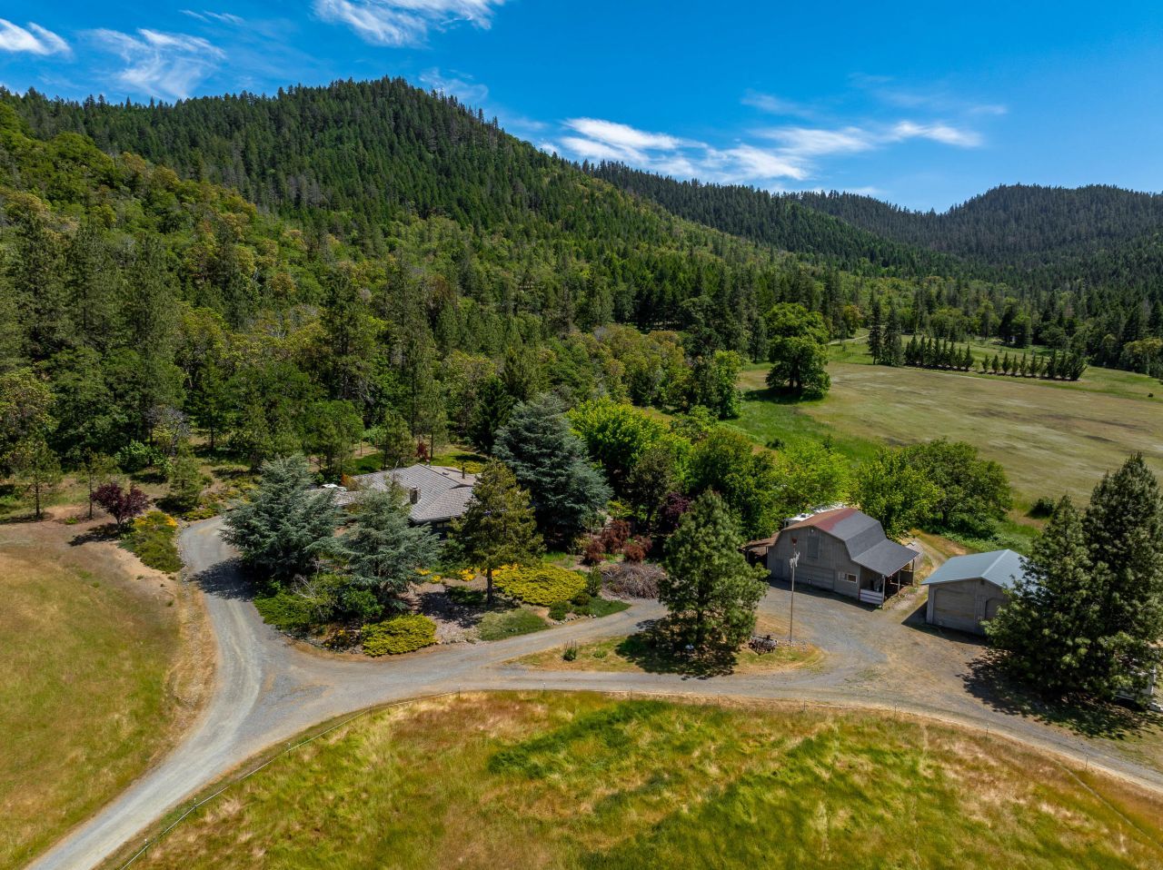 Turnkey horse property on 50 pristine, chemical-free acres with breathtaking panoramic views and 7 acres of water rights. Whether youre searching for an equestrian estate, hobby farm, or self-sufficient homestead, this property offers everything you need. A 2-stall horse barn with tack room, attached pasture, pole barn, hay storage, and an 8-stall equipment barn make this property ready for your horses or other animals. A mechanics garage with walk-down pit and a shop with loft space above handle the work side. Three ponds, 2 seasonal creeks, wooded trails, and a fenced garden complete the land. Solar power and a high-producing well round out this property that is currently producing 8 tons of grass hay annually without irrigation. The Frank Lloyd Wright-inspired main home sits tucked within beautifully landscaped grounds featuring fruit trees and mature shrubs. A separate, well maintained 3BD/2BA manufactured home is also included.