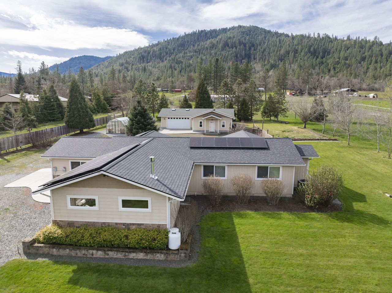 Beautifully-Kept Home & Matching Shop on just the right amount of Acreage in the Williams Valley! The Single-Level Home is Neat & Clean, with a Light & Bright Floor Plan. Main Features include a Large Living Room with Vaulted Ceilings, Spacious Kitchen with Granite Counters & Quality Stainless Appliances, Gorgeous Wood Floors, & a Large Master Suite with Private Access to the Rear Patio! The Expansive Rear Patio offers a Nice Covered Area & is perfect for Outdoor Living! 1500+ Sq Ft Shop is Amazing, with Three Garage Spaces, Huge Open Area with Painted Floor & Workbenches, plus Separate Storage Room. Other Outbuildings include a Just-Right-Sized Greenhouse & Storage Shed. Fully Fenced Property makes this ideal for Kiddos & Animals! Secure Gated Entry, Attached Two-Car Garage plus TONS of Parking for Any Vehicles. Fully-Owned Solar Power System, Brand New Roof, Generac Whole-House Generator, Beautiful Mountain Views & Move-in Ready! Everything here is done right & in its Proper Place.